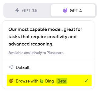 Une fois que tu as activé l’option, sélectionne le modèle GPT-4 > Browse with Bing
