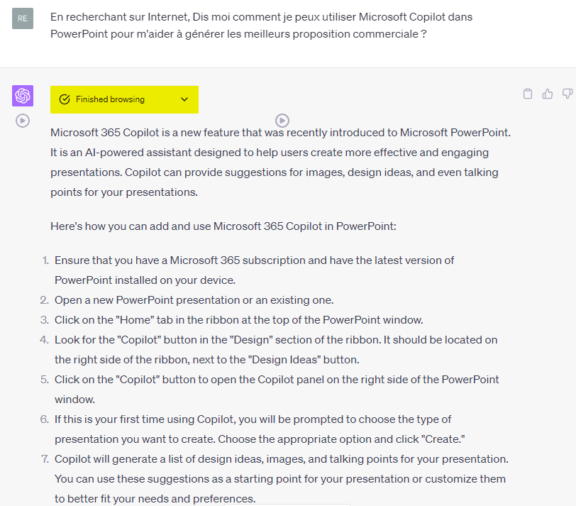 Dans le prompt ci-dessus, je demande à ChatGPT qu’il me dise comment je peux utiliser une fonctionnalité CoPilot dans PowerPoint pour faire de meilleures propositions commerciales (CoPilot est une fonctionnalité à base d’IA toute récente qui peut t’aider à générer des designs, images, …). Dans mon cas je voulais que ChatGPT m’aide pour mes propositions commerciales clients.