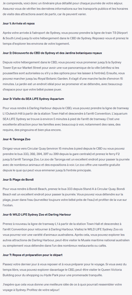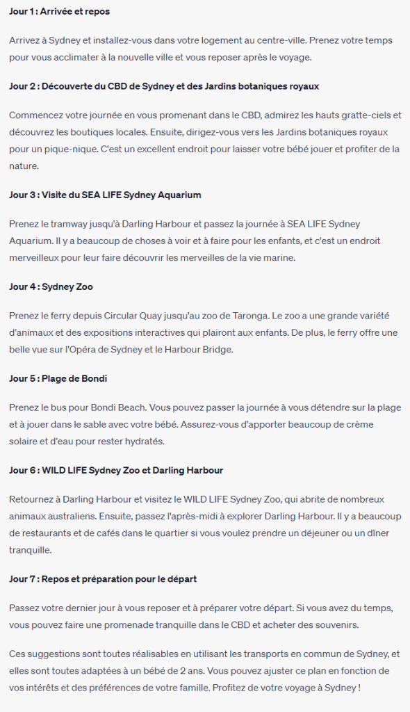 Il n’y a pas longtemps, je suis allé à Sydney, en Australie avec ma petite de 2 ans et ma femme. Je connais bien l’Australie, pour y aller assez souvent. Cependant, je me suis dit que ChatGPT pourrait m’aider à planifier mes vacances 😁