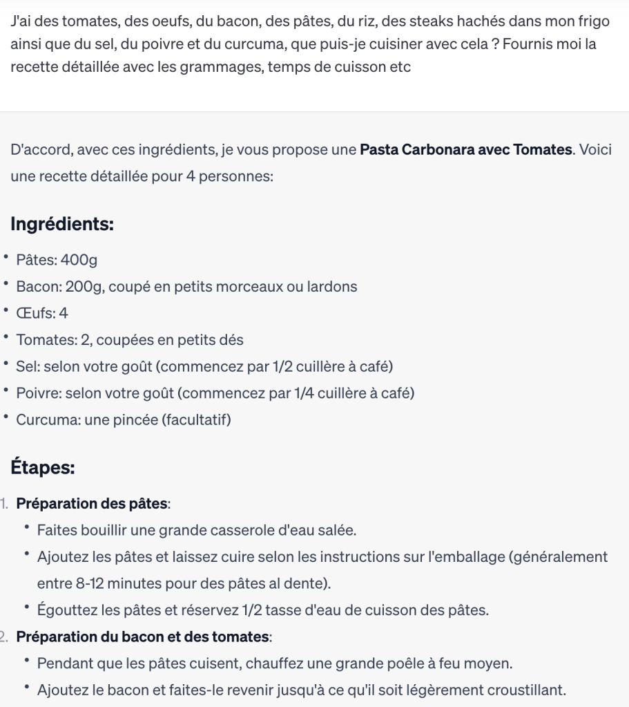 Depuis quelques mois, quand je dois cuisiner quelque-chose je sors mon meilleur assistant, j’ai nommé ChatGPT. Avec lui, je suis sûr que la recette proposée prend en compte uniquement les ingrédients que j’ai chez moi.