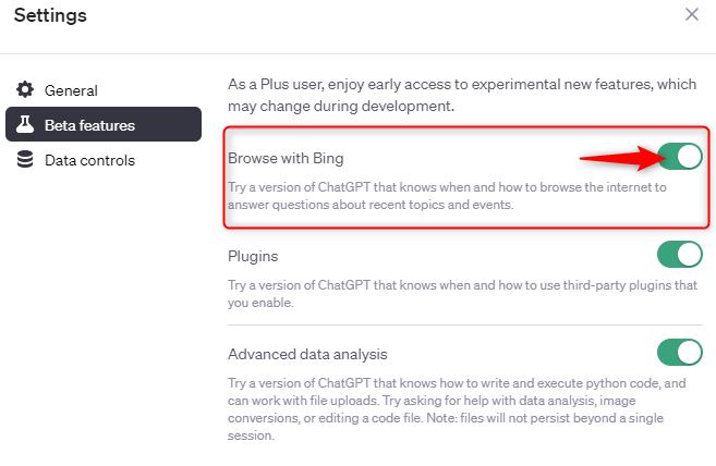 Dirige-toi ensuite dans « Beta features » et active la fonctionnalité « Browse with Bing« .