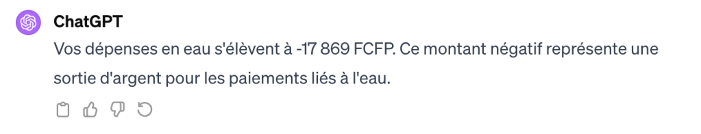 A titre d’information, cela m’a pris moins de 10 minutes. Le fichier CSV est assez simple et ne contenait qu’une trentaine de lignes. A faire manuellement j’aurai probablement mis 45 minutes à 1 heure. Cela m’a permis d’économiser ce temps, mais également de pouvoir requêter le fichier après comme de savoir quelle est la part de dépense en eau :