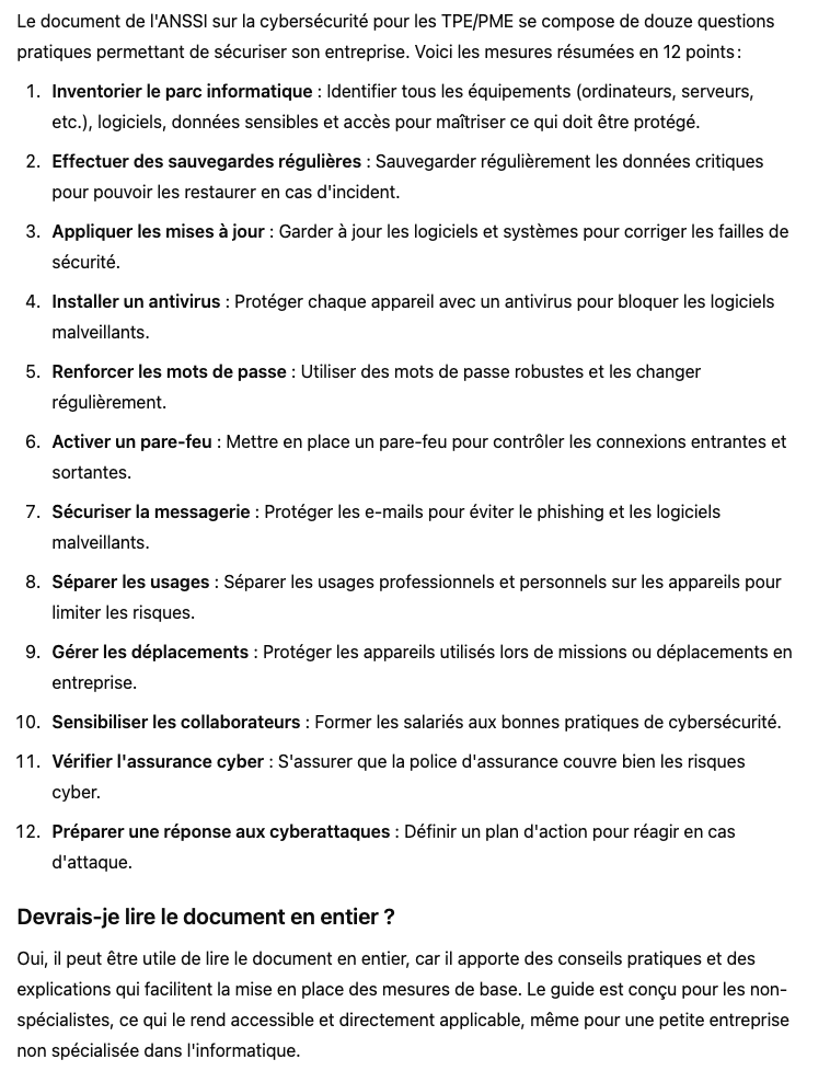Je vais prendre comme exemple un guide de l’ANSSI sur la cybersécurité pour les PME en 12 questions (https://www.entreprises.gouv.fr/files/files/secteurs-d-activite/numerique/anssi-guide-tpe_pme-cybersecurite.pdf). Le document est un peu long et avant de le lire, il est intéressant d’avoir un bref résumé et un avis sur l’intérêt ou non (en fonction de son contexte) de lire le document entier 👇