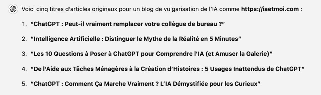 Mets-toi dans la peau d'un blogueur qui tente de vulgariser l'IA, et plus particulièrement ChatGPT. L'adresse de ton blog est https://iaetmoi.com. Propose moi 5 titres d'articles qui n'existent pas sur ce blog