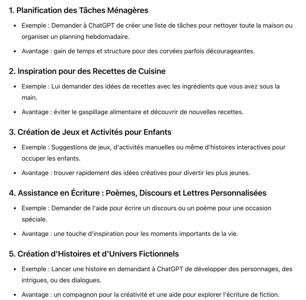 Globalement j’utilise énormément ChatGPT pour de la production de contenu ou du brainstorming (sur des idées, sur une réponse, sur du contenu existant ou à venir). Il est plutôt très bon là-dedans et me fait gagner un temps fou 👍